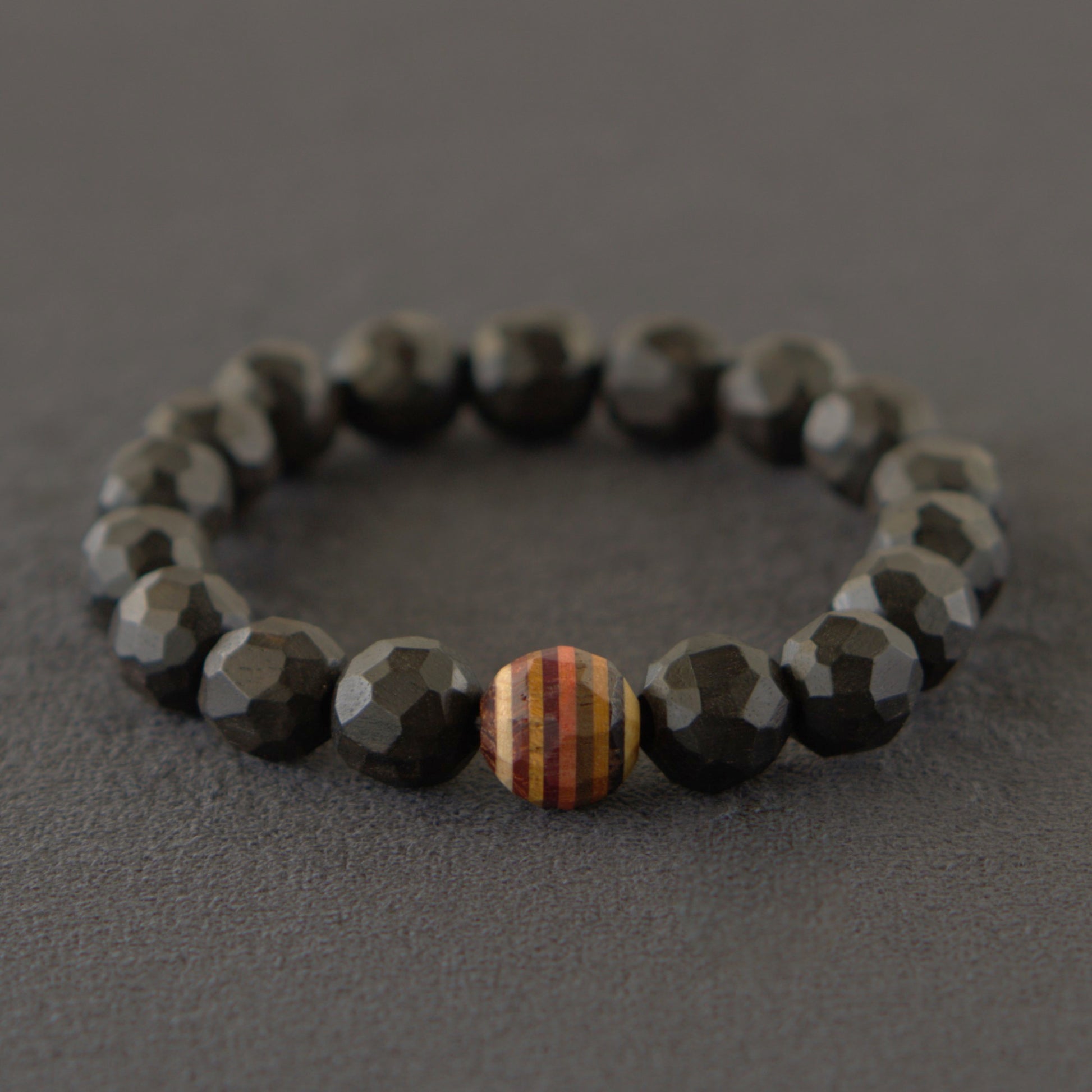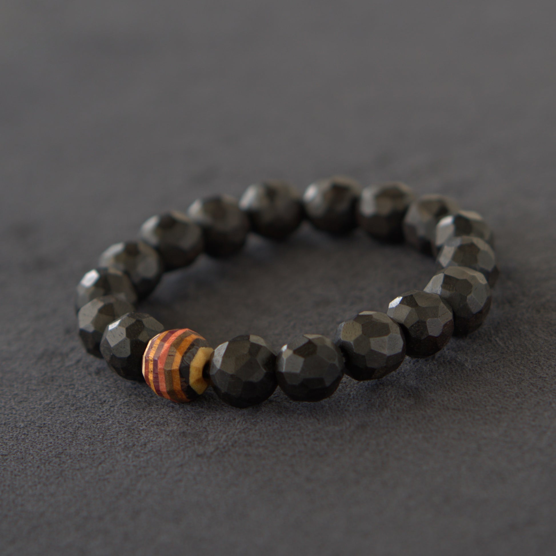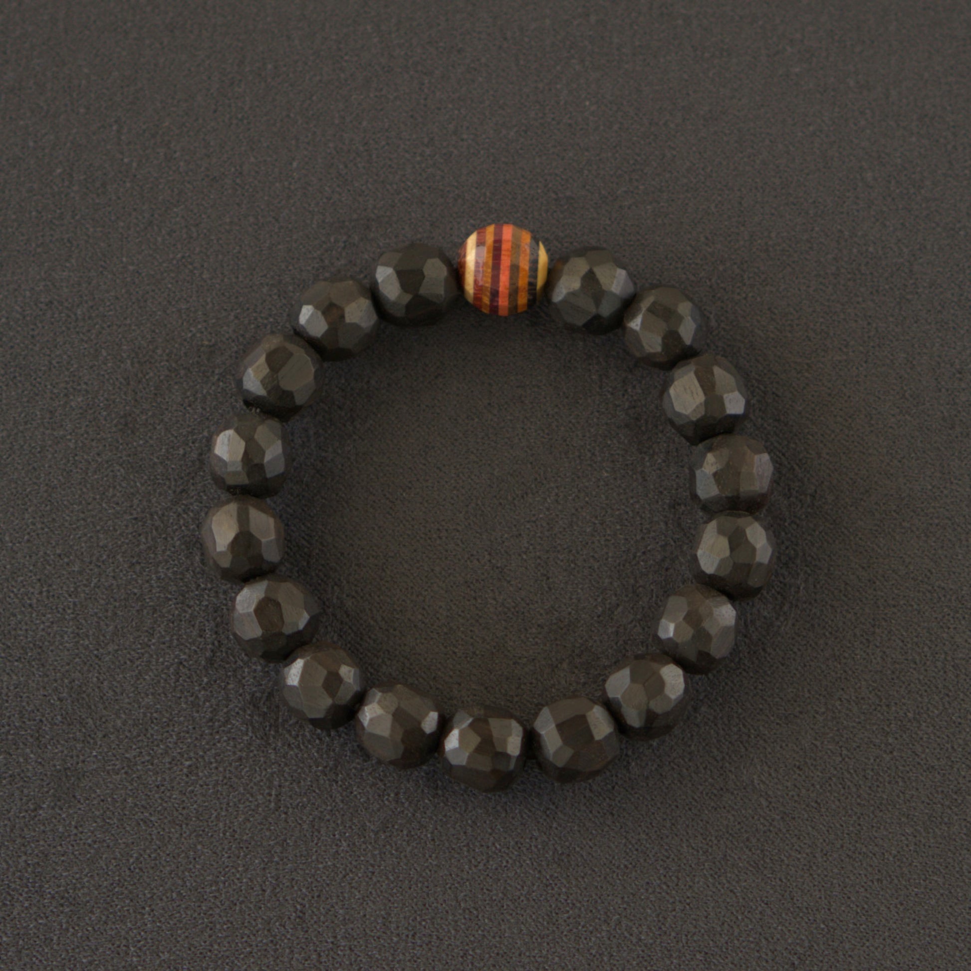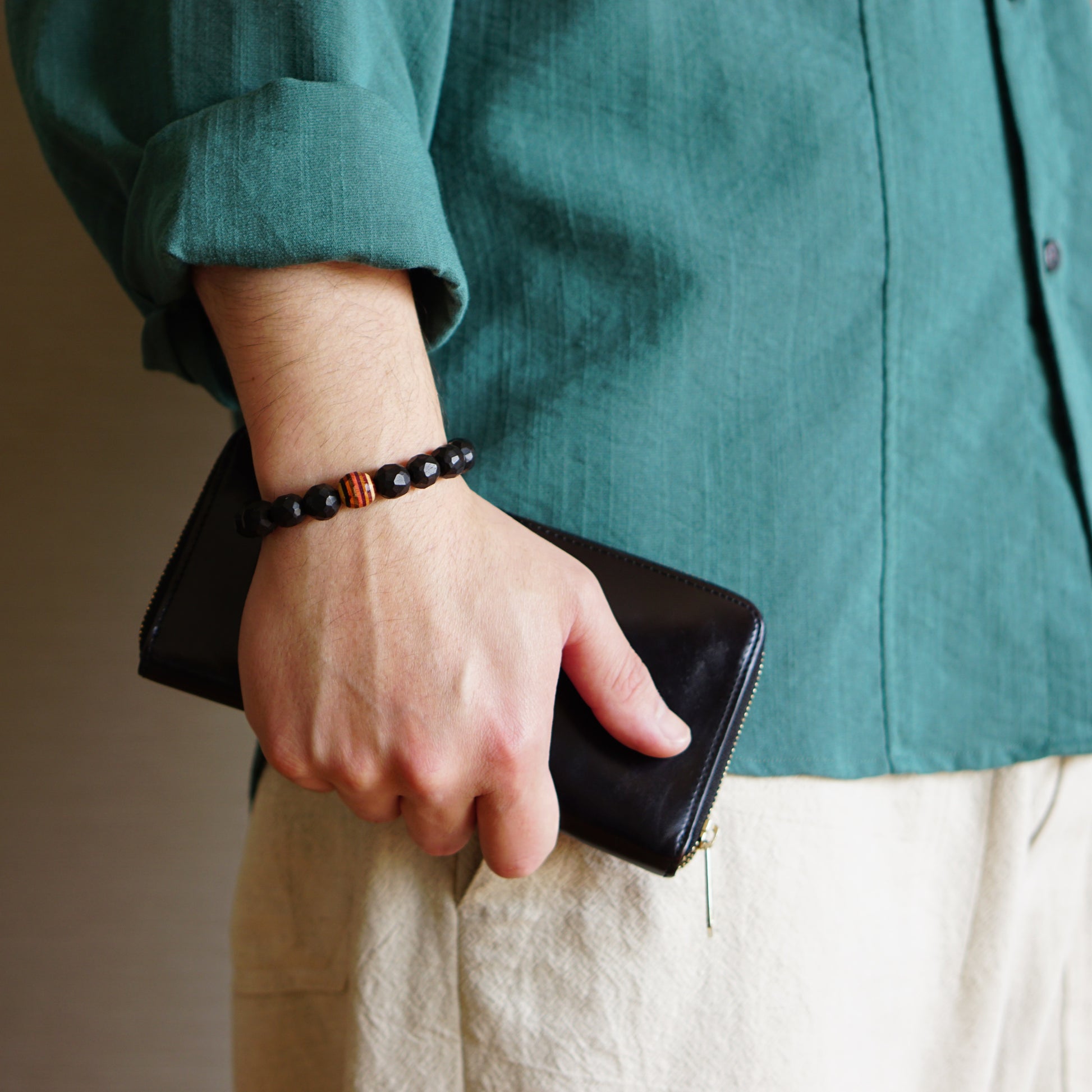 「一つ」に向き合ってみました。メインの黒色の木材はエボニー。その中でも深い黒色だけを厳選し、ビーズ一つ一つを手作業で加工することで世界に一つだけのロックカットを実現。また世界中の銘木一つ一つの個性を楽しんでもらえるように、ワンポイントとして10種の寄木ビーズをあしらっています。合計11種の天然木が調和した、世界に唯一無二のアイテムです。